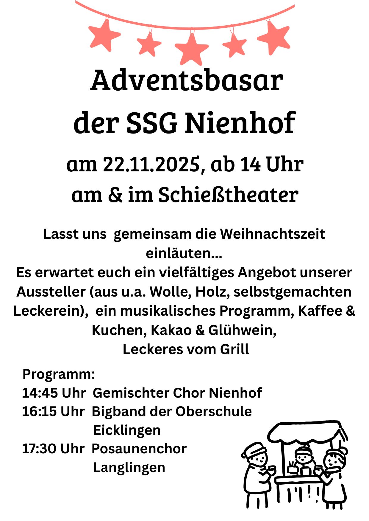 Präsentieren Sie ihre Werke in einer gemütliche Atmosphäre in unserem Schießtheater und Dorfgemeinschaftshaus. Wir freuen uns auf handgemachtes Kunsthandwerke, originelle Geschenkideen, weihnachtliche Dekorationen, Woll- und Garnarbeiten und vieles mehr.